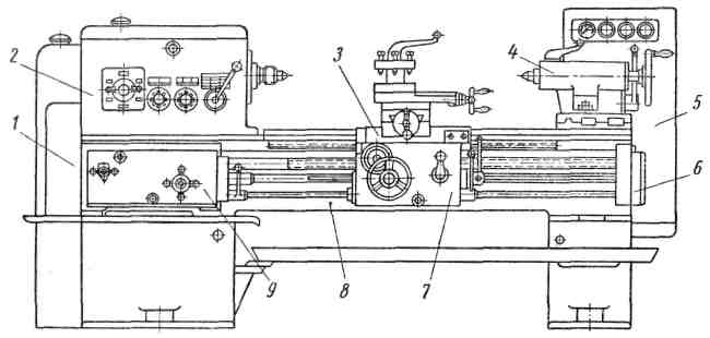 1 кожух ограждения гитары сменных колес; 2 передняя бабка; 3 суппорт; 4 задняя бабка; 5 шкаф с электрооборудованием; 6 привод быстрых перемещений суппорта; 7 фартук; 8 станина; 9 коробка подач.