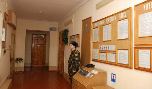 Черговий днювальний несе службу всередині казарми біля вхідних дверей, поблизу кімнати для зберігання зброї.