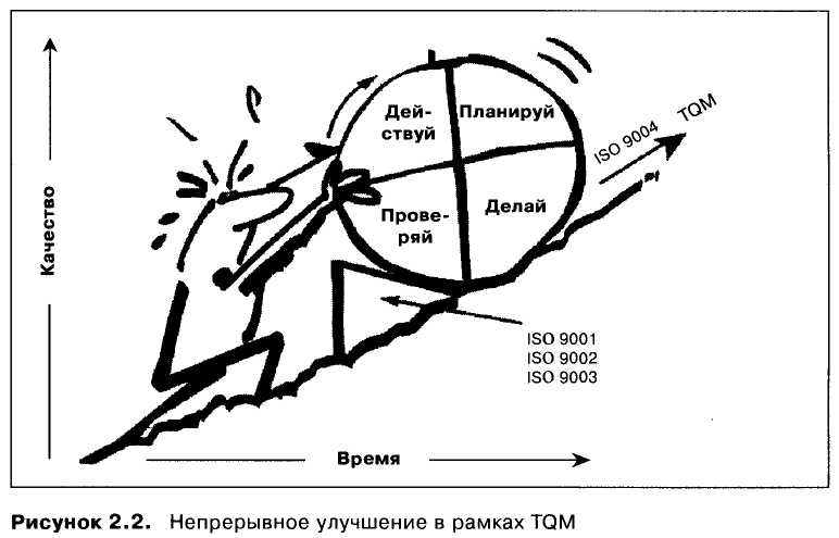 Таким образом, TQM это комплексный метод постепенного и систематического улучшения всех аспектов деятельности организации, предполагающий напряженную работу, дисциплину, интенсивное обучение и последовательное использование определенных инструментов и ресурсов. TQM эффективно, только если все сотрудники организации усваивают такое отношение к качеству и приобретают соответствующие навыки и менталитет. Непрерывный процесс обучения никогда не заканчивается, это циклический, итеративный и не прекращающийся вид деятельности. Его можно рассматривать как логическое продолжение того пути, каким исследование проблем повышения качества шло до введения TQM (см. рис. 2.1).