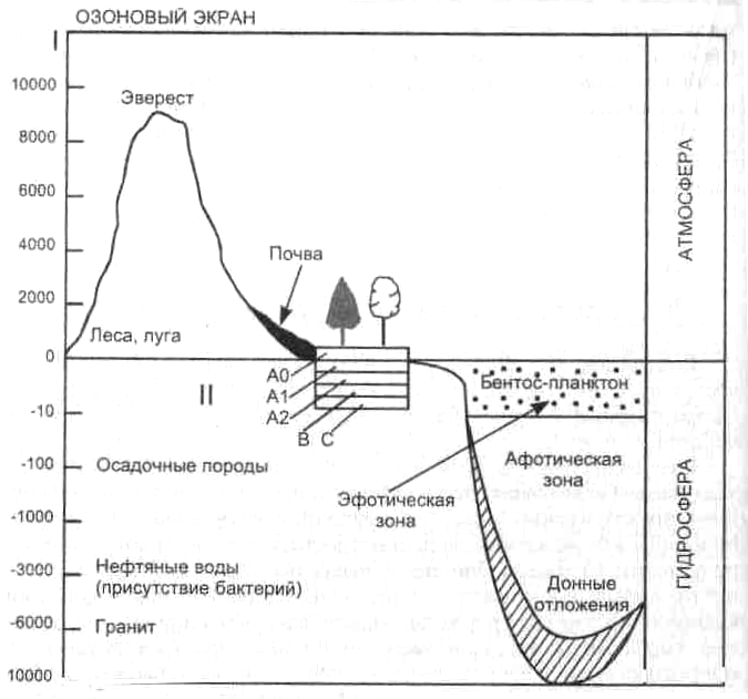 I пределы жизни в биосфере; II схематический разрез почвы: А0 лесная подстилка, А1 гумусовый горизонт, А2 горизонт вымывания (подзолистый), В горизонт вымывания (иллювиальный), С подстилающая порода.