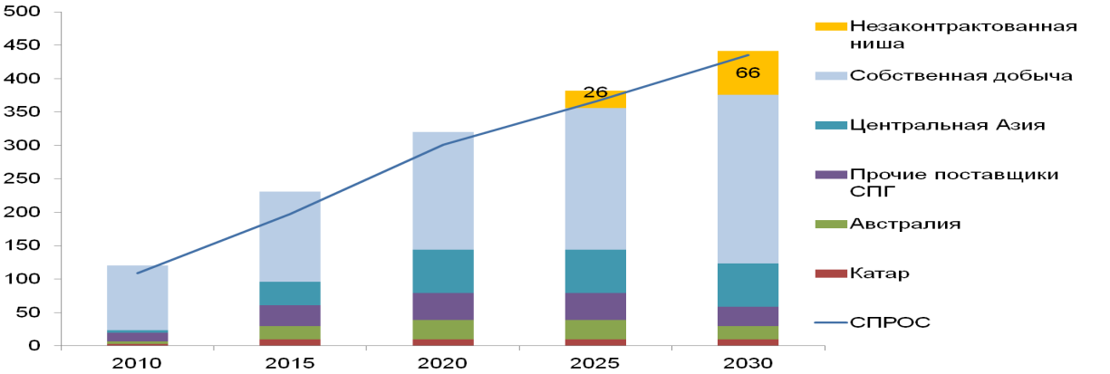 Азиатские потребители, в частности Китай, не готовы на такие затраты. С 2004 года, когда Китай начал импортировать газ, Пекином были заключены довольно выгодные соглашения с Казахстаном и Узбекистаном по поставкам газа. Переговоры с российскими газовыми поставщиками продолжаются уже давно, но договоренности по цене по-прежнему не достигнуты. Россия предлагает для Китая цену на газ, равную с европейскими потребителями. Но Китай предпочитает заключать контракты с Туркменией, Казахстаном и Узбекистаном, которые предлагают относительно меньшую цену. На сегодняшний день, китайский спрос на газ законтрактован вплоть до 2020 года, а в 2025 и в 2030 остались сравнительно малые доли5.