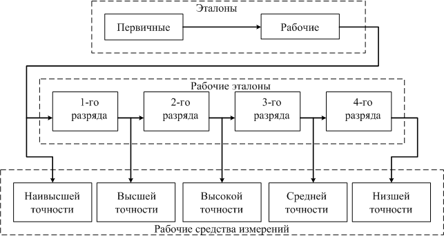 На рис.1 показана метрологическая последовательность передачи размеров единиц физических величин от первичного эталона рабочим, от рабочих эталонов рабочим мерам и измерительным приборам (рабочим средствам измерений).