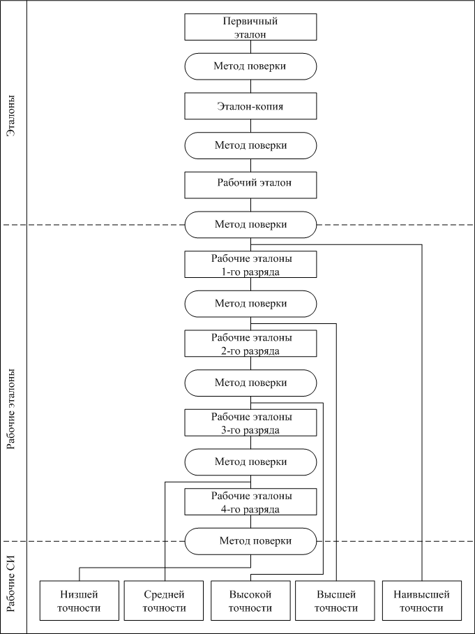 Поверочная схема нормативный документ, который устанавливает соподчинение средств измерений, участвующих в передаче размера единицы от эталона к рабочим средствам измерений с указанием методов и погрешности, и который утвержден в установленном порядке