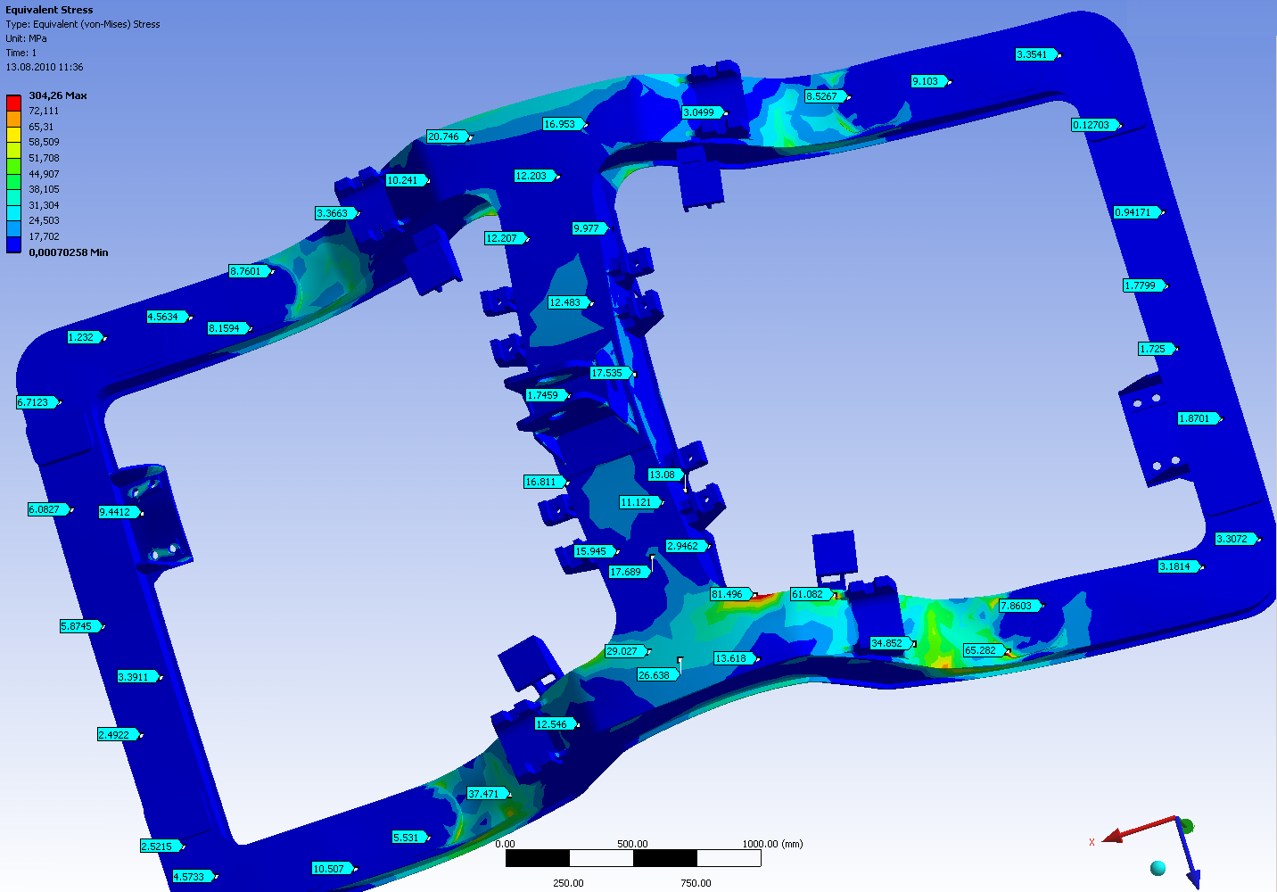 - методика сквозного проектирования, при которой силы, полученные в результате компьютерного моделирования взаимодействия экипажа и пути, применены для прочностных расчетов несущих конструкций экипажной части (в первую очередь рам тележек). Расчетные результаты подтверждены в ходе стендовых и динамико-прочностных испытаний. Рама принята в производство без доработок;