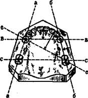Рис.359. Виды направления кламмерных линий: а-а и б-б сагиттальное, в-в и с-с трансверзальное, е-е диагональное.