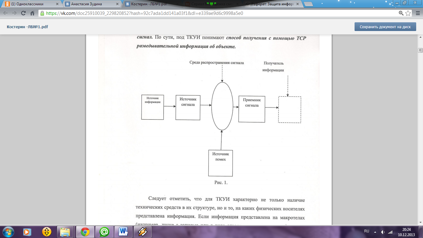 Физический путь несанкционированного распространения носителя с защищаемой информацией от ее источника к злоумышленнику образует канал утечки информации. В зависимости от вида носителя информации каналы ее утечки различаются структурой. Если распространение информации происходит с помощью технических средств, то соответствующий канал называется техническим каналом утечки информации (ТКУИ). Обобщенная структура типового ТКУИ приведена на рис.2