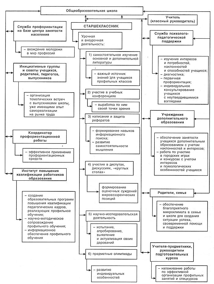 Дальнейшие эксперименты способствовали созданию системы факультативов, а также классов и школ с углубленным изучением предметов, существующих и по сей день. По своей сути знакомые всем специализированные математические, спортивные, гуманитарные и другие классы являются в известной степени профильными. Главное отличие заключается, пожалуй, в невозможности полного отказа от некоторых предметов, обязательных к изучению во всех школах страны. Появившиеся в конце 80-х новые образовательные учреждения, гимназии, колледжи - во многих случаях осуществляли профильное образование за счет увеличения нагрузки по отдельным предметам, а также введения новых дисциплин - риторики, латинского языка, философии и других. При сохранении существующей системы в целом это неминуемо привело к целому ряду проблем - перегрузке, конкурсному набору в эти учебные заведения (даже в 1 класс) и т.п. Однако нужно отметить, что благодаря лицеям, гимназиям и колледжам, а также гимназическим и лицейским классам в обычных школах тысячи детей получили возможность выбора образовательных услуг, необходимых им для поступления в те или иные вузы, а также для развития индивидуальных интересов и наклонностей [6, 7, 8].