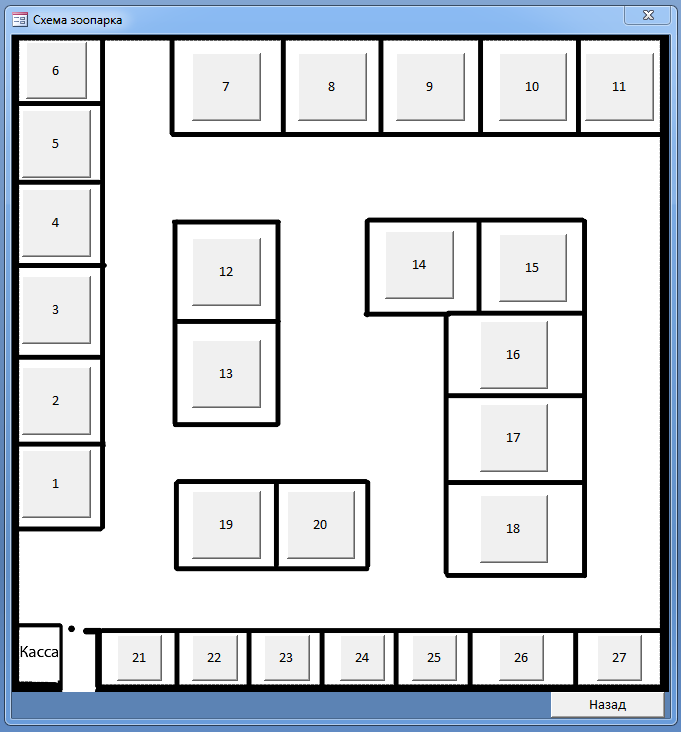 3.1 Для правильной работы нашей базы данных в таблице 1 отсутствует место расположения животных. Для этого нарисуем схему вольеров зоопарка. Добавим нашу схему на форму. Создадим кнопки для перехода на каждый отдельный вольер.
