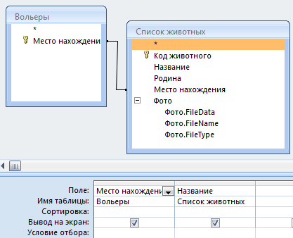 Для этого занесем в запрос строки из таблиц "Вольеры \ место нахождения" и "Список животных \ название".