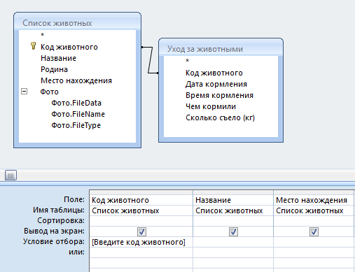 Выбираем запрос выборка. заносим в запрос таблицы "Уход за животными" и "Список животных", выбираем строки которые будут показываться при поиске. В добавленной нами строке "код животного", прописываем следующие условия отбора [Введите код животного]. В результате при выполнении данного запроса появляется строка поиска и после ввода нужной нам информации выдается результат.