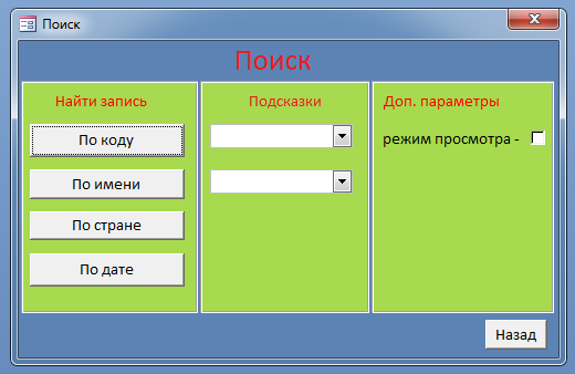 Для организации поиска в нашей БД сначала стоит определится с параметрами которые мы будем искать. В данной базе данных поиск будет организоваться по: Коду животного, имени животного, Стране откуда животное и поиске по дате кормления.