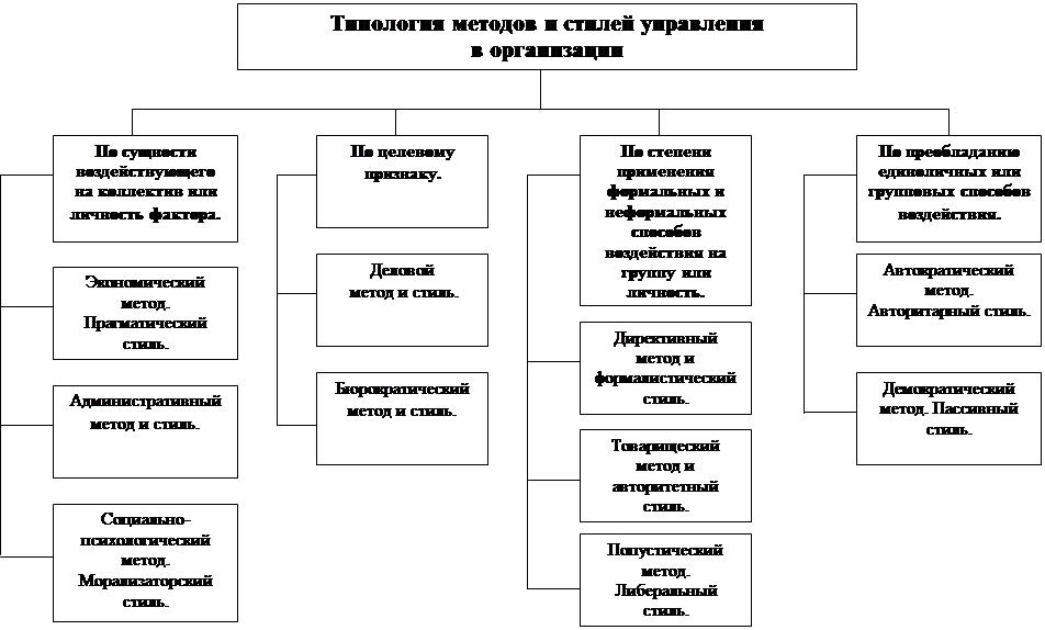 - по сущности воздействующего на группу или на личность фактора: это экономический, административный и социально-психологический методы и, соответственно, прагматический, административный и морализаторский стили;