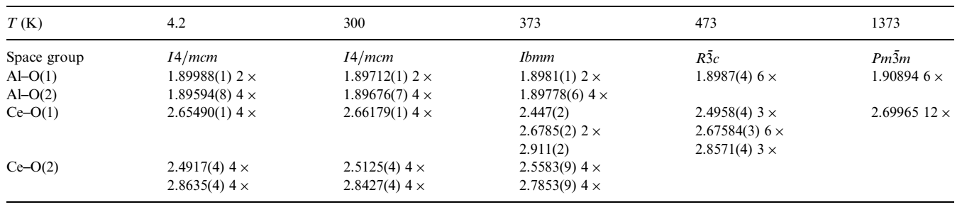 Перовскит церия имеет тетрагональную решетку, пространственной группы I4/mcm, a=5,32667, с=7,5824. Для кристаллов CeAlO3 характерно несколько полиморфных переходов в интервале температур от 273 до 1373К. В кристалле наблюдается следующая последовательность переходов: I4/mcm Imma Rc Pmm, что соответствует изменению типа решетки: тетрагональная ромбическая ромбоэдрическая кубическая. В таблице 1 приведены изменения длин связей.