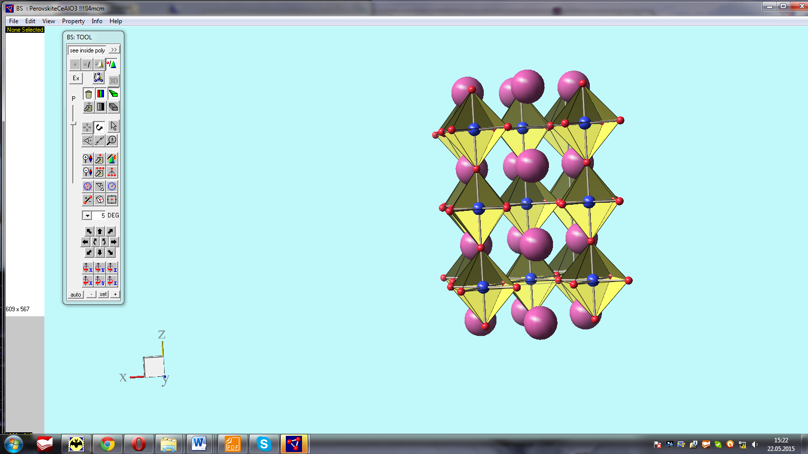 В данной работе исследовались Кристаллы CeAlO3 выращенные методами Чохральского и EFG (Edge Defined Film Fed Growth) на установке индукционного нагрева «Оксид» в среде особо чистого Ar. Рост проводили из вольфрамового полусферического тигля диаметром 45мм при скорости вытягивания 1,5-15мм/час и скорости вращения 0-20 об/мин. Восстановительный потенциал среды получали за счет испарения расплава и взаимодействия паров с углеродной теплоизоляцией. В качестве исходного сырья использовали порошки CeO2 и Al2O3 взятые в соотношении, обеспечивающем получение CeAlO3. Исходные порошки перемешивали, прессовали, сушили и спекали в слабо-восстановительной среде Аr+СО при температуре 1650-1800°С в течении 10-60 часов. Восстановительный потенциал среды создавали с целью перевода церия в трехвалентное состояние. В результате твердофазного синтеза получили поликристаллический алюминат церия (рис.1) составом CeAlO3 перовскитной структуры, пространственной группы I4/mcm, a=5,32667, с=7,5824 (рис. 2, рис. 3).