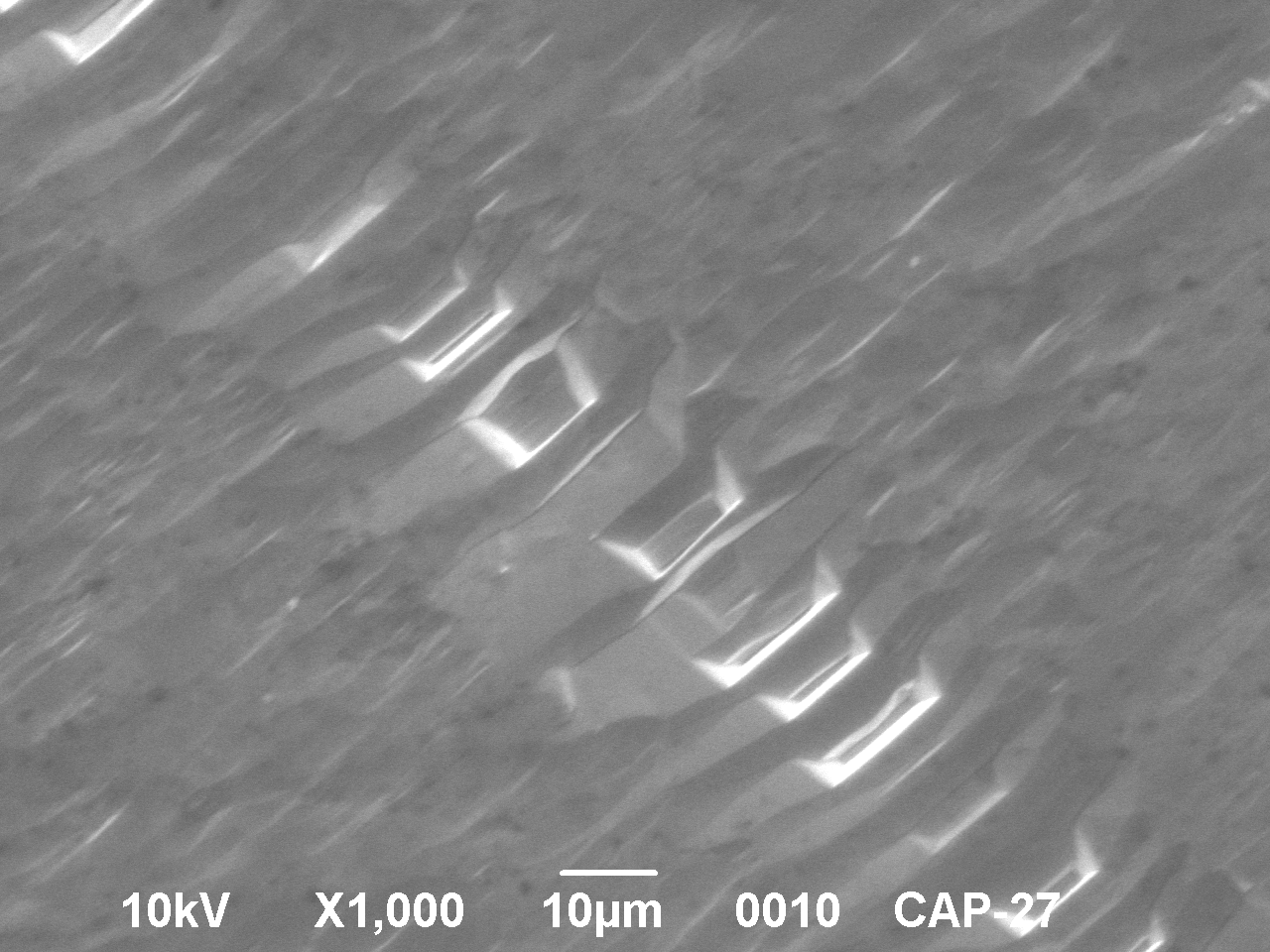 - В полированном образце, изготовленном из данного кристалла, присутствовала дефектная полосчатая структура (рис.4), которая появилась в процессе механической обработки. Полосы можно было наблюдать только под определенным углом освещения. В некоторых местах, они проходили по всей толщине образца, но он не разрушался на части и обладал достаточной прочностью. Эти полосы внешне похожи на трещины, но таковыми не являются. Шаг и расположение полос указывает на влияние кристаллографических особенностей решетки. Однако, в некоторых образцах присутствовали отдельные пакеты полос расположенные перпендикулярно друг другу, а так же области, где полосы отсутствовали. Наличие таких дефектов резко снижает оптическое пропускание образцов, поэтому их природа и механизм формирования требуют отдельного изучения.