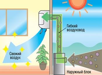 В системе Exclusive атмосферный воздух поступает в помещение из наружного блока по гибкому армированному воздуховоду