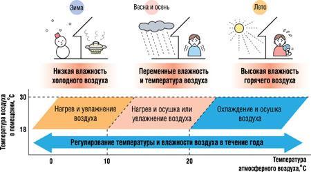 Так, зимой он может увлажнять воздух, причем при низкой температуре в комнате ему придется совмещать этот процесс с интенсивным нагревом. В дождливую погоду межсезонья он осушит или увлажнит воздух - в зависимости от нестабильных значений температуры и влажности атмосферного воздуха. Летом кондиционер может осушать воздух и, с ростом температуры на улице, ему придется совмещать этот процесс с интенсивным охлаждением.