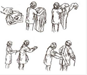6. Набросить халат на обе руки сразу. Поднять руки вверх и в стороны. Помощник расправляет и натягивает халат, держа его за внутреннюю сторону. Завязывает тесемки вдоль халата. |