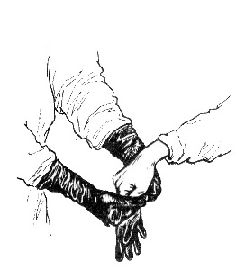 12. Взять перчатку левой рукой, завести за оборот перчатки, закрыв П, Ш, IV,V пальцы. |