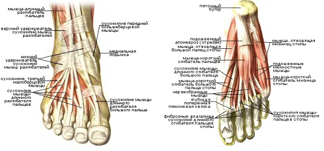 Мышцы стопы. Разгибание пальцев стопы осуществляют, помимо мышц голени, и собственные мышцы, расположенные на тыле стопы (короткий разгибатель пальцев и короткий разгибатель большого пальца стопы).