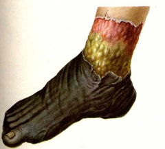 Гангрена омертвление живых тканей (частей органов или участков тела) с характерным изменением цвета пораженных областей от черного до темно-коричневого или синеватого. Изменение окраски обусловлено сульфидом железа, образующегося в результате разрушения гемоглобина.