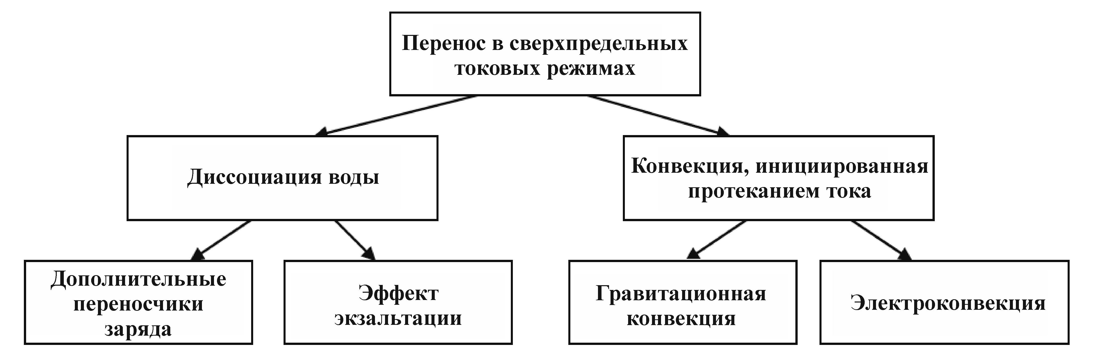 Рисунок 1 Схема механизмов переноса в сверхпредельных токовых режимах [1]
