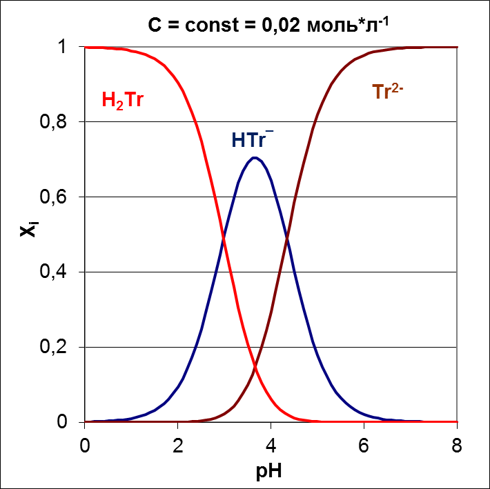 Рисунок 3 Содержание в растворе H2T и ионов HT, T2 (в мольных долях Xi) в зависимости от рН раствора