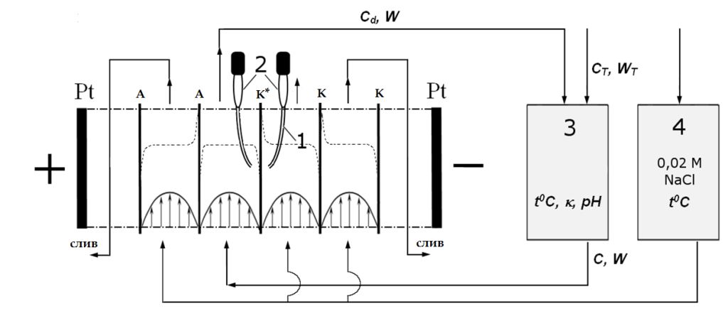 - медленное (не более 1%/мин) [37] изменение концентрации pH-статируемого раствора, поступающего в канал обессоливания для обеспечения квазистационарного процесса обессоливания;