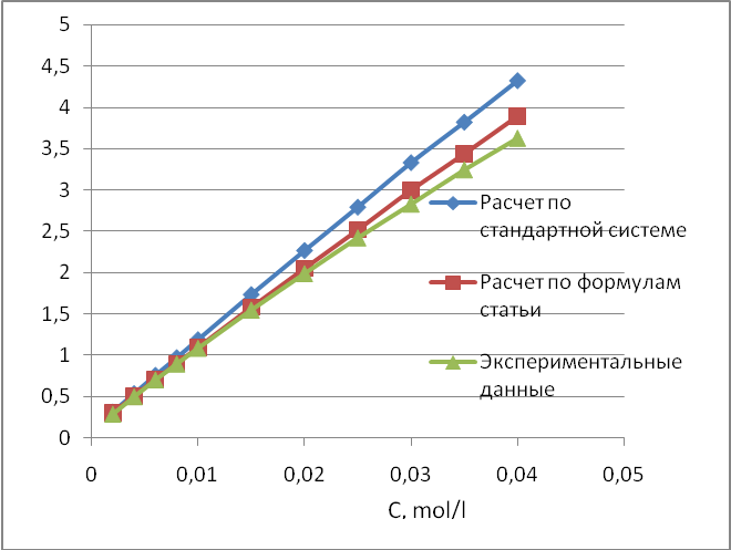 Сравнение результатов расчёта и экспериментальных данных (рисунок 6) показало, что влияние ионной силы раствора необходимо обязательно учитывать, не смотря на то, что мы работали в области достаточно разбавленных растворов. В этом случае относительная ошибка не превышала 6 %