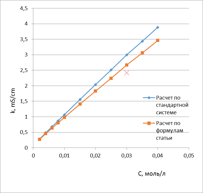 Калибровочные зависимости были рассчитаны с использованием закона Кольрауша. Способ первый в формулу (24) подставляли значения эквивалентных электропроводностей для бесконечно разбавленных растворов. Способ второй для расчётов использовали значения эквивалентных электропроводностей, найденные с учётом влияния на эти величины ионной силы раствора. Для учёта этого влияния использовали формулы (19)-(23), выведенные в статье [39].
