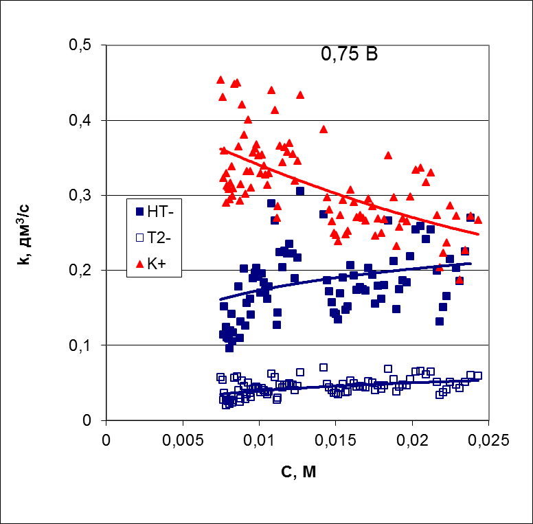 Из анализа этих данных следует, что коэффициент массопереноса катиона калия через катионообменную мембрану растёт с разбавлением раствора. Эти данные находятся в хорошем согласии с литературными данными для NaCl.