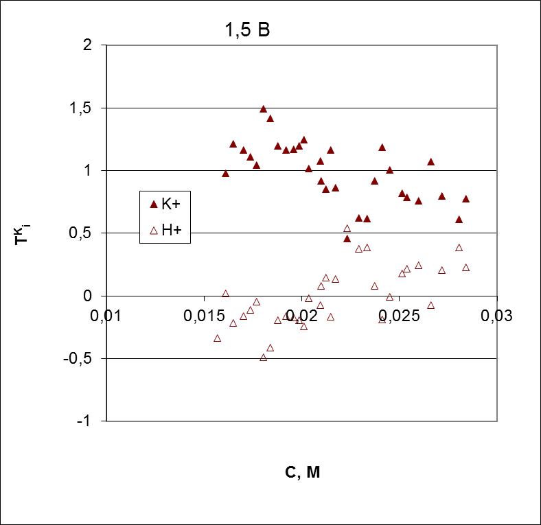 при концентрации 0,008 М. В то же время числа переноса протонов через катионообменную мембрану практически равны 1 и слабо меняются в исследованном диапазоне концентраций. Увеличение скачка потенциала до 1,5 В приводит к ещё более резкому росту коэффициента массопереноса иона калия с разбавлением раствора.