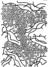 Исследования внутреннего строения ТПЭ Нафион показали, что он имеет двухфазную структуру. Основа полимера (гидрофобная фаза) состоит из фторуглеродных и эфирных цепей, расположенных в пространстве таким образом, что функциональные сульфогруппы группируются внутри сферических полостей диаметром 40 . Система связанных узкими каналами полостей, содержащих гидратированные катионы, представляют собой вторую, гидрофильную фазу мембраны[2].