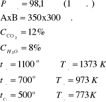 Вычислить плотность теплового потока, обусловленного излучением дымовых газов к поверхности газохода сечением AxB. Состав газов задан. Общее давление газа . Температура газов на входе в газоход и на выходе . Средняя температура поверхности газохода .