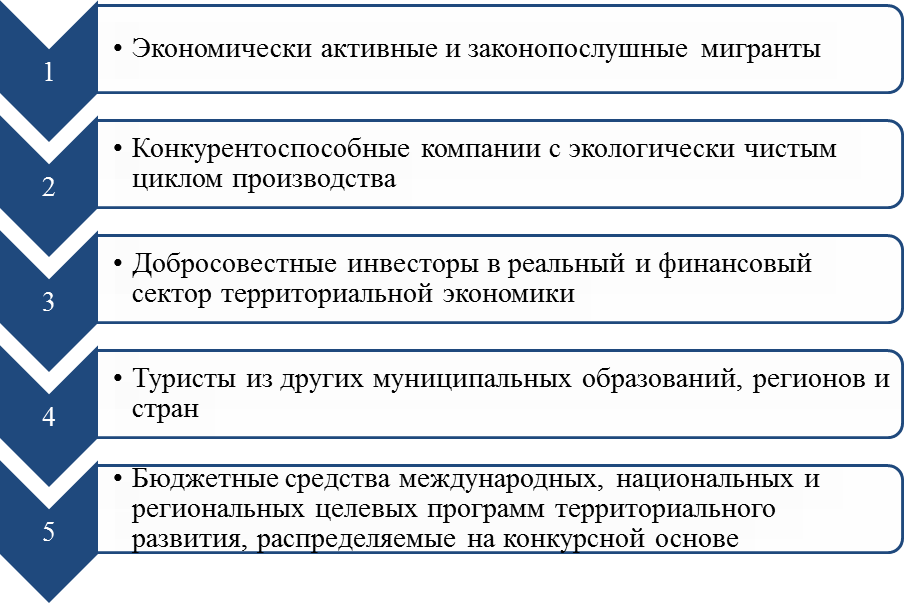 Экономически активное население, рабочие места, связанные с приходом на территорию компаний, инвестиции, внешние и внутренние туристы, субсидии бюджета вышестоящего уровня и некоторые другие объекты |