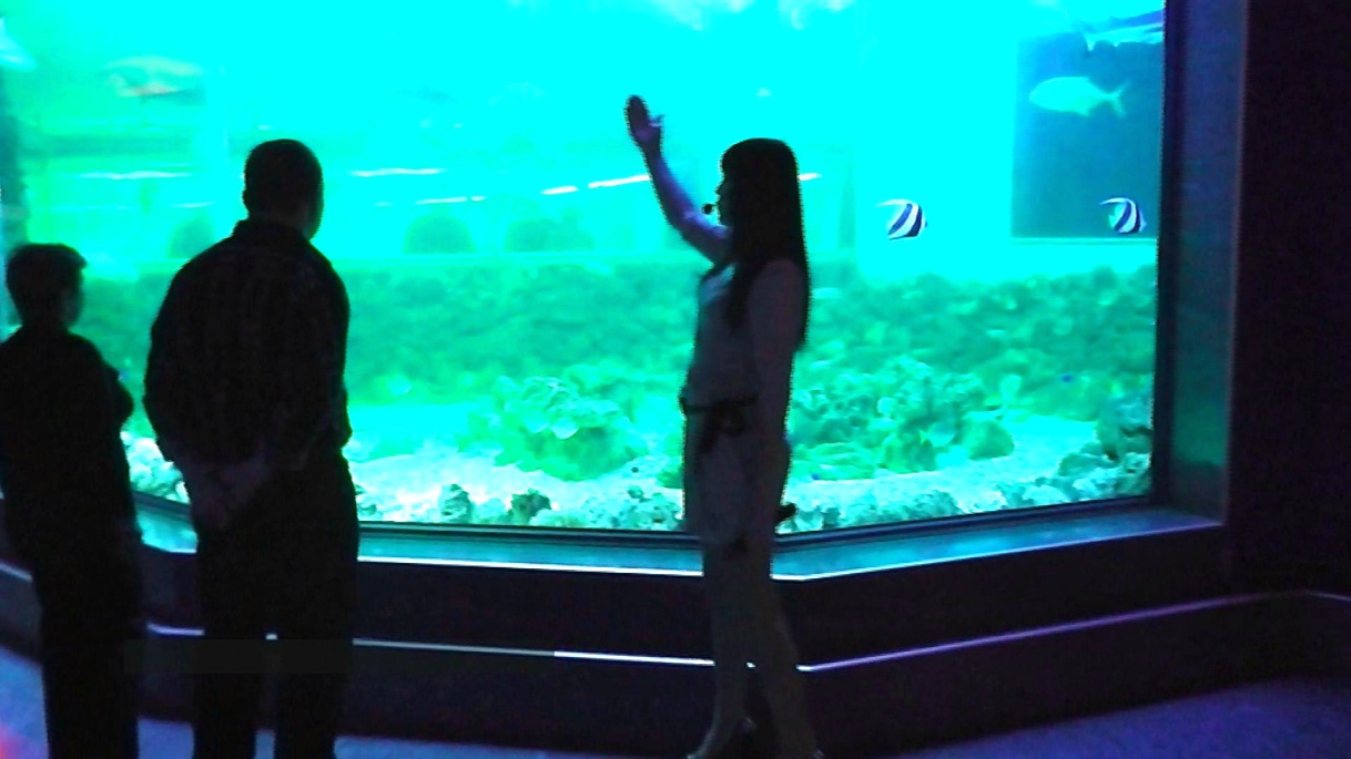 Далее группа приглашается пройти в тоннель к аквариуму с Кошачьими акулятами. [рис.22] Экскурсовод располагается справа, а группа слева от него. Освещается следующая информация, которая занимает 2 минуты времени. Детеныши Кошачьей акулы, вылупленные из яиц, на территории океанариума. Крылатки, имеют красивое оперение. Укол буквально четырех перышек, может оказаться смертельным. Голубой Хирург. Окраска на тельце, напоминает цифру шесть или девять, эту рыбу называют девяткой.