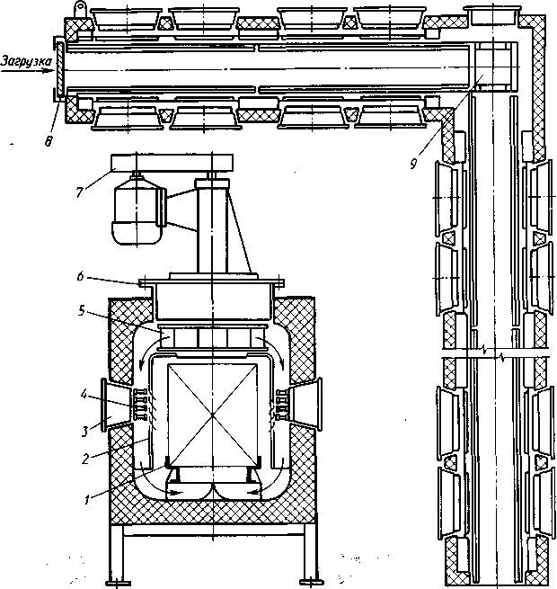 Теплота от нагревателей к деталям в основном передается воздухом, циркулирующим в печном пространстве (на рис. 2 показано стрелками). Воздух при движении нагревается от нагревательных элементов и затем отдает теплоту деталям. Местный перегрев деталей исключен благодаря наличию экрана и циркуляции воздуха. Поддоны двигаются в печи по направляющим . Для изменения направления движения поддонов предусмотрена плита 9. Механизмы перемещения поддонов вынесены за пределы печи. Со стороны загрузки предусмотрена заслонка 8 с механизмом подъема. Циркуляционный вентилятор 7 с крыльчаткой 5 установлен на своде печи с помощью уплотнительного фланцевого соединения 6. Цилиндр гидравлического толкателя печи смонтирован на раме. Шток цилиндра соединен с подвижной кареткой. Поддоны перемещаются по направляющим. Каретка имеет катки и кулачки для перемещения поддонов. При движении каретки вперед кулачки захватывают и передвигают поддон вперед. При движении каретки назад кулачки утапливаются, и каретка возвращается под поддоном в исходное положение.