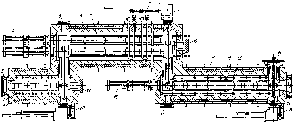 Поддон из камеры 1 в камеру 6 передается поперечным цепным толкателем 20. Камера предварительного подогрева однорядная. В ней размещается шесть поддонов. Цементационная печь двухрядная. Передаваемый в нее поддон устанавливается перед одним из толкателей 4 и проталкивается в сторону выгрузки. В однорядную камеру 11 поддоны по одному передаются поперечным цепным толкателем 9.