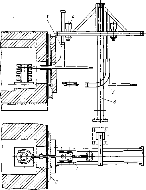Механизм выгрузки крупных зубчатых колес из цементационной печи показан на рис. 5. Механизм представляет собой захват 2 со смешанным электрическим и ручным приводом. Захват перемещается вверх и вниз электромеханическим приводом 4, а в печь и из нее вручную рычагом 5. Рычаг через подвеску 3 соединен с кареткой 1, перекатывающейся по балкам, которые поддерживаются колонной 6.