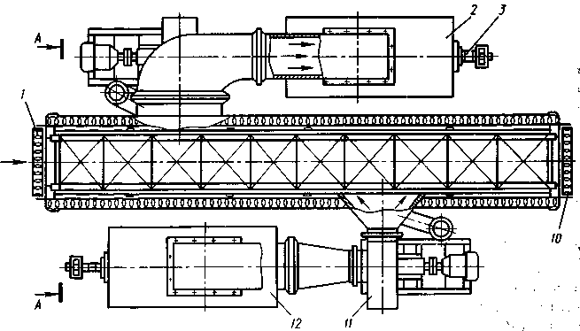 Газы в топку двигаются в результате разрежения, которое создается в топочном пространстве вентилятором. К продуктам сгорания, прошедшим через печь, добавляют высоконагретые продукты сгорания газа и поднимают их температуру до требуемой.