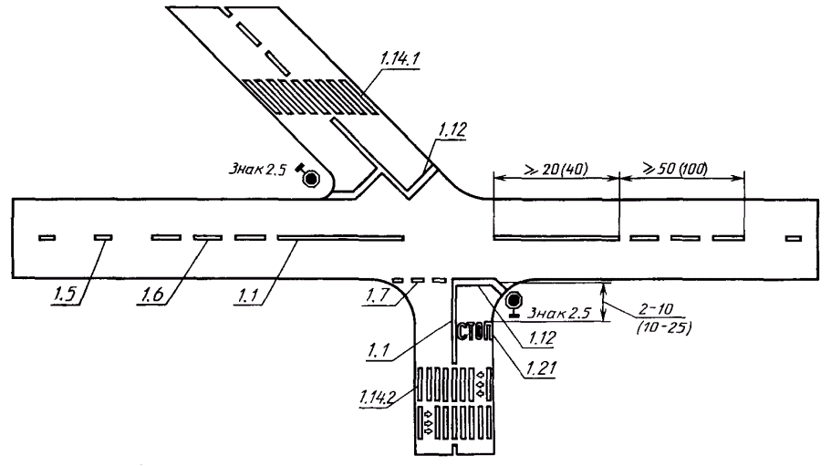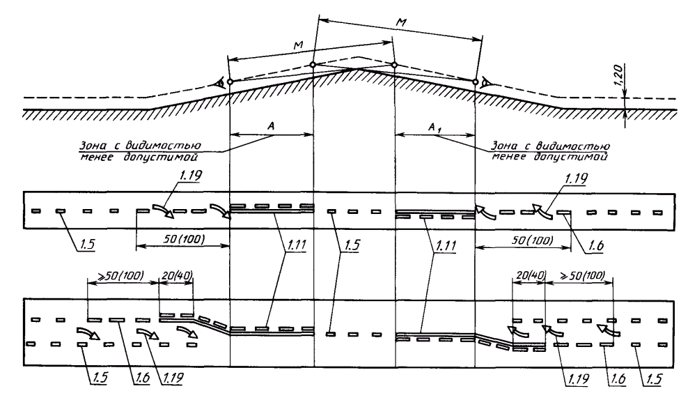 Разделение транспортных потоков противоположных направлений на кривой в плане осуществляется с помощью сплошной линии 1.1 при условной плавности закругления кривой Р 19,0. В остальных случаях разделение потоков осуществляется с помощью прерывистой линии 1.5