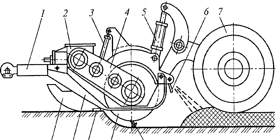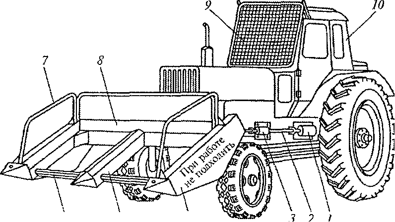 1боковой ВОМ трактора; 2 карданный вал; 3 опора подшипника; 4 боковая балка рамы; 5 центральная балка рамы; 6 рабочий орган (фреза); 7 трубчатое ограждение; 8 щит-отражатель; 9 ограждение; 10 трактор