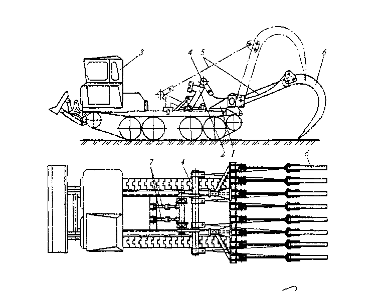 тительности вперед и предохранения трактора от забивания листьями и стружками. За фрезами между боковыми 4, центральной 5 балками и основанием рамы имеются два сквозных проема (окна), необходимых для прохождения и укладки под трактор срезанной древесно-кустарниковой растительности. Вращающий момент на фрезы 6 передается от бокового ВОМ 1 через карданный вал 2, повышающий конический редуктор и клиноременную передачу.