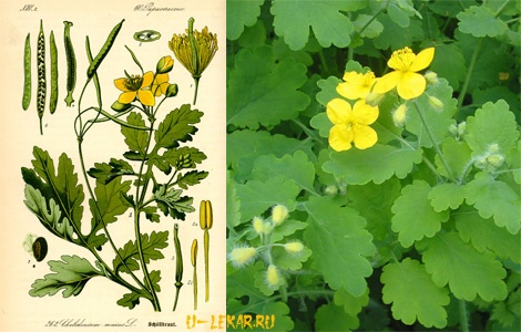 Чистотел большой многолетнее травянистое растение высотой 80100 см с многоглавым коротким корневищем и толстым стержневым ветвистым корнем, снаружи красно-бурым, внутри желтым. Стебли ребристые, облиственные, ветвистые. Прикорневые листья и нижние стеблевые на черешках, верхние сидячие, очередные. Все листья глубоко перисто-раздельные (шаровидно-перисто рассеченные) с 35 парами долей: доли круглые, неравномерно-городчатые, верхняя доля наиболее крупная, обычно трехлопастная; окраска листьев сверху зеленая, снизу сизая. Цветки желтые, венчик правильный, состоит из 4 обратнояйцевидных лепестков длиной 8 16 мм. Чашелистиков 2, голых или опушенных, полностью закрывающих бутон и при раскрывании цветка опадающих.