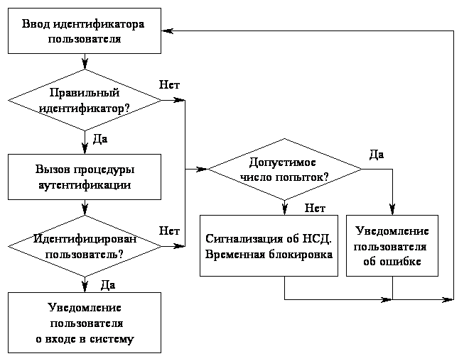 Общая процедура идентификации и аутентификации пользователя при его доступе в АС представлена на рис. 2.10. Если в процессе аутентификации подлинность субъекта установлена, то система защиты информации должна определить его полномочия (совокупность прав). Это необходимо для последующего контроля и разграничения доступа к ресурсам.