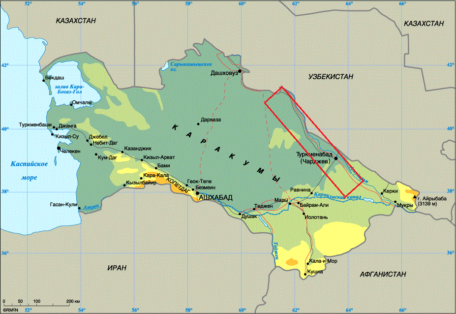 Рисунок 1 Физико-географическая карта Туркмении (квадратом выделена Приамударьинская область) [1]