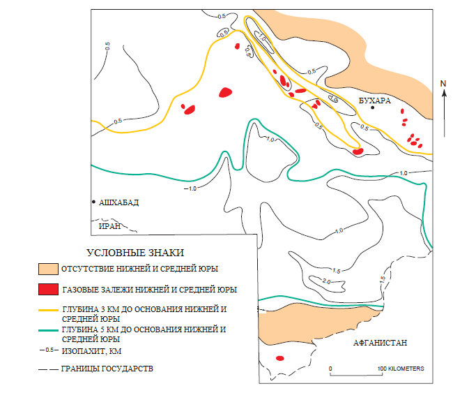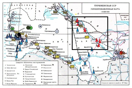 Цифрами обозначены месторождения: 1. Хангиран; 2.Даулетабад; 3. Карабиль; 4. Ислим; 5. Шатлык; 6. Майское; 7. Яшлар; 8.Ходжа-Гугердаг; 9. Анго; 10. Байрам-Али; 11.Учаджы; 12. Малайский; 13.Aчак; 14. Газли; 15. Кокдумалак; 16. Уртабулак; 17. Самантепе; 18.Шуртан.