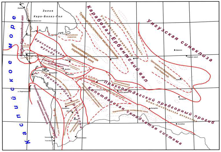 Фундамент бассейна Аму-Дарьи характеризуется четко выраженной дроблением блока структуры. В дополнение к основным региональным разломам, показанным на рисунке 7, большое количество других нарушений были определены, которые граничат со структурными единицами бассейна и обычно разделены на более мелкие поднятия и опущенные блоки.Нарушения прослежены вверху осадочного чехла или выражены там изгибами. Большинство нарушений были сформированы во время неоген-четвертичной тектоники. Однако, некоторые из них активируются по старым разломам. Например, региональный разлом, что пересекает депрессию Хива-Заунгузских возобновлен по триасовому грабена-расколу. Большинство известных местных антиклинальных структур бассейна Аму-Дарьи молоды, и они были сформированы неогеновое время тектонических деформаций. Многие из структур имеют амплитуды в диапазоне от 200 до 400 м, расположены в линейных зонах антиклиналей по разломам. Местные антиклинали сформированы до неогена. Древние антиклинали были выявлены в некоторых областях, например, на подножиях Бухарской и Чарджоуской ступеней, на поднятии Бадхыз-Маймане, и в прогибе Копет-Даг и в прилегающих районах к востоку и северу . Некоторые антиклинальные структуры юры и мела испытывали непрерывное поднятие в неогеновое время, и другие были погребены под более молодыми породами. Различные местные структуры присутствуют на Каракумском поднятии и на моноклинали Бахардок. Эти изометрические структуры, по площади небольшие поднятия, с диаметром меньше 50 м. Судя по всему, они присутствовали в неогеновое время, так как многие из структур на моноклинали Бахардок наклонены и открыты на севере [25].