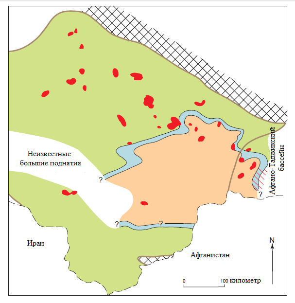 На востоке бассейн Аму-Дарья примыкает к афгано-таджикскому (Южнотаджикский) бассейну (рис. 9). Два бассейна формируют единый бассейн до миоцена, от юрского периода-до олигоцена. Начиная с миоцена территория подвергается поднятию до настоящего времени, Афгано-Таджикский блок деформируется на север от выступа Памир. В результате сжатия с востока на запад, сформировалась серия антиклинорий и синклинорий, которые подстилаются надвигами с вдоль юрского соленосного комплекса [16]. Синклинали были заполнены неоген-четвертичными орогенными молассовыми обломочными породами, толщиной в несколько километров.