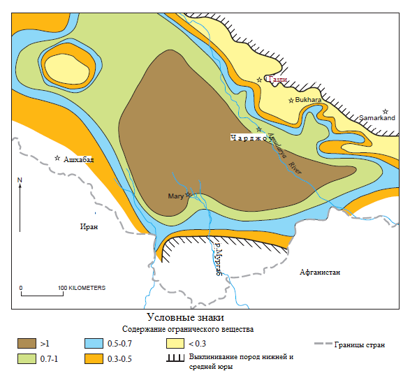Нефтематеринскими породами, поставляющими УВ в карбонатные рифовые коллекторы являются породы нижней-средней юры. Накопление среднего содержания органического углерода в нижний-среднеюрских породах бассейна Аму-Дарьи распределено от центра >1% к периферии бассейна до 0,3% (рис.18).